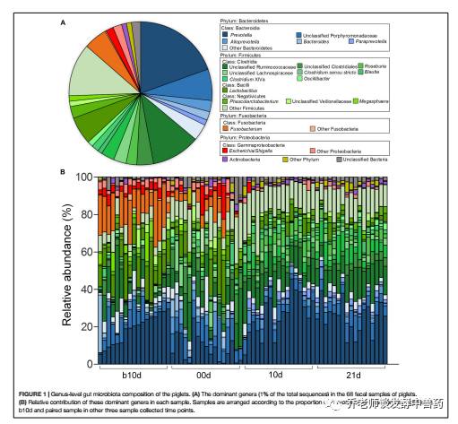 断奶仔猪早期是非常容易发生腹泻的,而一些研究证据表明肠道菌群起到至关重要的作用。采集来自于江西省的一批仔猪进行研究,分别在断奶前10天、断奶当天、断奶后10天和断奶后21天采集粪便样品进行高通量测序,分析肠道微生物变化情况。总体来讲:断奶后当天至10天这个阶段菌群变化较大,而断奶后10天到20天这个阶段变化不大。吸吮仔猪肠道中主要菌群:梭杆菌属、乳杆菌属、拟杆菌属、埃希氏杆菌属/志贺氏菌属和巨型球菌属;断奶后肠道菌群:梭状芽孢杆菌属、梭菌属XIVa、罗氏菌属、Paraprevotella属和Bautia属。