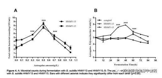 经过近年来的研究,我实验室在动物肠道中分离出芽孢菌,经生理生化特性鉴定和16s rRNA序列测定为枯草芽孢杆菌,经过优化培养条件,HNMY-13和HNMY-15具有降解黄曲霉毒素的能力,降解率分别为80.48%和79.55%。发酵后芽孢数可在8×108以上。同时,两株枯草芽孢杆菌在发酵中药黄芪方面,也显示出一定的优越性,可提高黄芪多糖产率,HNMY-13多糖产率为4.93%,比对照组提高1.7倍,HNMY-13多糖产率为3.54%。本研究为益生菌在降解黄曲霉毒素和发酵黄芪中的应用提供理论基础及试验依据。我实验室该成果刊登在2017年第9期《African Journal of Biotechnology》。